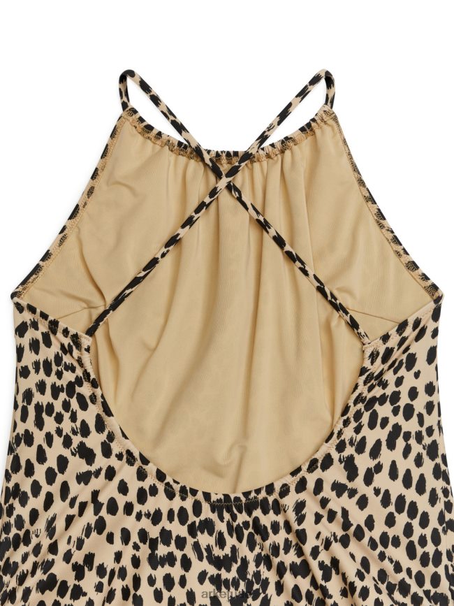 بدلة سباحة مصممة بتفاصيل مجمعة عند خط الرقبة، وحمالات كتف رفيعة متقاطعة من الخلف وفتحة ساق منخفضة. مكتمل الصف.
