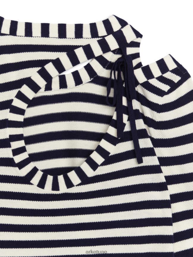 سترة محبوكة من مزيج القطن. تفاصيل شريطية عند الرقبة وتفاصيل مقصوصة على الكتف تمتد إلى الخلف. تفاصيل فيونكة في الخلف وأكمام واسعة قليلاً.